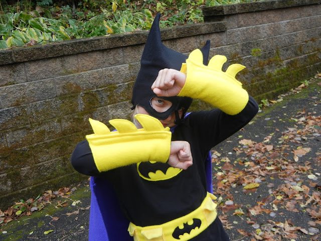 The helmet was tricky. Grace specifically wanted a helmet rather than a mask. I'm not thrilled with how it turned out but didn't want to spend forever and a day on it either since the other parts of the costume will likely get more wear. I started with a tube shape that fit her head, tweaked the tube shape to make the bat ears (gluing in a piece of craft foam to make them stick up nicely), then fiddled around for far too long trying to get the eyes and nose to look decent. I couldn't really get the part around the eyes/nose to fit tighter and closer to her face, but oh well. Its all soft fleece so its comfortable and it gets the general 'Batman' theme across. A bit of elastic holds it taut in the back. We did a trick-or-treat activity yesterday in the windy cold weather and she wore the helmet for two hours straight both trick-or-treating and playing at the park so it must be comfortable enough and it kept her ears nice and warm.