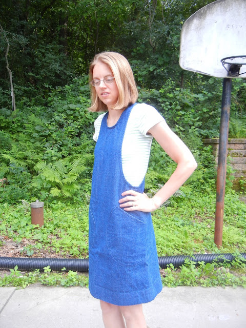 Quick hem and off you go! I made a size XS and that seems just about right. I love the placement and size of the scoop pockets - they're perfect. The hip area and skirt are just right too. The two things I tweaked on my second version were on the upper bodice. I lowered the neckline scoop one inch at the center front (one inch lower than the higher neckline offered in the pattern, that is) and also widened the bodice at the center front. On my denim one the straps felt too close to my neck to be comfortable. Between the closeness to my neck and the neckline being a bit snug I found myself always readjusting so I wouldn't be choked by the pinafore when I sat down. Lowering the neckline and widening the center front makes everything sit in the right place. Its more comfortable and it stays put. (I did a 2.5 inch total slash and spread of the bodice area on the front and back pieces - so 1.25 inches from the center fold - and blended that wider bodice into the bottom of the armhole area to keep the proportions/design lines the same.) Those adjustments also make it much easier to put on... with no closures, a too small neckhole, and a pretty straight skirt its a bit of a trick to get the denim one over my head!